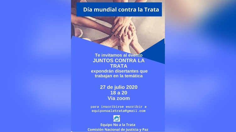 El Equipo “No a la Trata” de la Comisión Nacional de Justicia y Paz en Argentina ha convocado para el próximo lunes 27 de julio un encuentro virtual sobre trata y tráfico de personas a través de la plataforma ZOOM en el que participarán especialistas de organizaciones sociales, religiosas, funcionarios judiciales, poder ejecutivo y legislativo del país. El encuentro virtual se desarrollará de las 18.00 a las 20.00 horas para dialogar e informar sobre este delito que en Argentina somete a medio millón de personas, entre víctimas de trata laboral y sexual. Para inscribirse tan solo debes enviar un correo a: equiponoalatrata@gmail.com