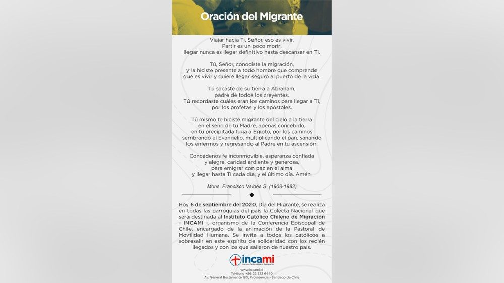 El Instituto Católico Chileno de Migración (INCAMI) invita a sumarse a la Colecta y a la celebración nacional, el próximo domingo 6 de septiembre del Día Nacional del Migrante. Con este evento se busca promover acciones de cercanía y solidaridad ante la urgencia que la pandemia de Covid-19 ha añadido a la ya difícil situación de los migrantes, los más pobres entre los pobres.