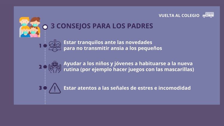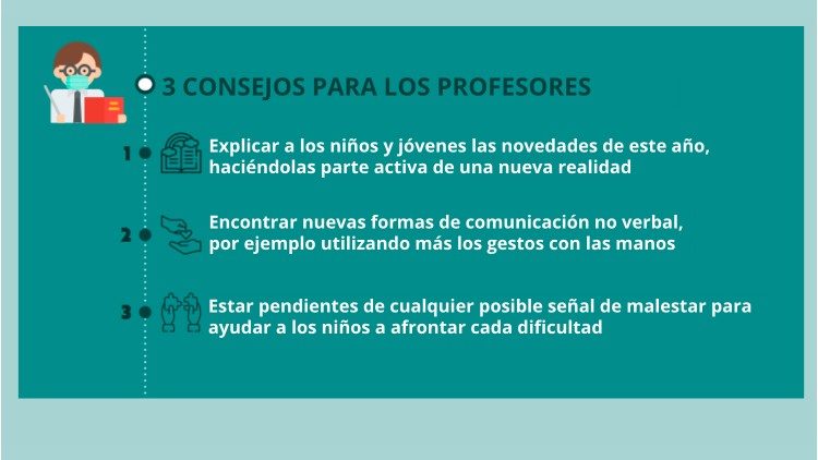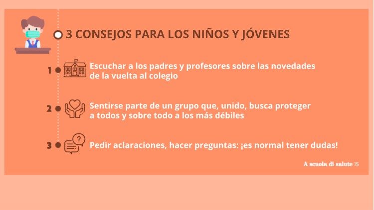 Niños y jóvenes: el consejo para los más jóvenes es confiar y escuchar atentamente a los padres y profesores sobre las novedades del regreso a la escuela; no tener miedo de hacer preguntas, aclarar dudas con la ayuda de los adultos de referencia y sentirse parte de un grupo que, juntos, trata de proteger a todos, especialmente a los más débiles.