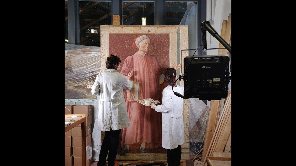 Una de las imágenes más famosas de Dante Alighieri recupera su esplendor original. El fresco de Andrea del Castagno, conservado en la Galería de los Uffizi de Florencia y sometido a seis meses de restauración por los técnicos del Opificio delle Pietre Dure de Florencia, se presenta en su ligereza, propia de la pintura mural.