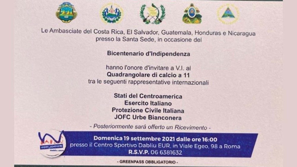 Miembros y representantes de varios países de Centroamérica se reunieron en Roma para festejar el Bicentenario de sus respectivas independencias. El domingo 19 de septiembre, a las cuatro de la tarde, se llevó a cabo un torneo cuadrangular organizado por los embajadores centroamericanos ante la Santa Sede, guiados por el de Guatemala, Alfredo Vásquez Rivera y por Mario Scola, ex comandante de la Gendarmería vaticana y presidente de uno de los equipos participantes, el JOFC Urbe Bianconera.