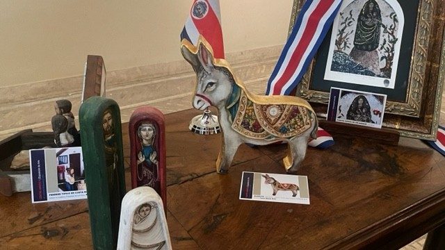 Las obras que ha traído representan a diferentes santos, pero para hacer cada santo, dijo la artista, hay que estudiarlos para saber su esencia. Trajo una representación del nacimiento del Niño Dios, San Maximiliano María Kolbe, la Virgen en diferentes advocaciones, y diversas representaciones del Cristo, como el de Esquipulas. La artista costarricense escribe íconos sobre óleo, sobre tablas y esculturas en madera. Una de sus últimas obras, fue un mosaico develado hace un año, en los Jardines Vaticanos, de la Virgen de los Ángeles, hecho en piedras y telas, representando a la Patrona de Costa Rica
