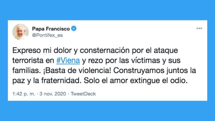 A través de un telegrama firmado por el cardenal Secretario de Estado, Pietro Parolin, el Santo Padre expresó su pésame por las víctimas del atentado y mediante un tweet publicado en su cuenta Oficial de Twitter, aseguró sus oraciones por las víctimas y sus familias: "¡Basta de violencia! Construyamos juntos la paz y la fraternidad. Solo el amor extingue el odio".
