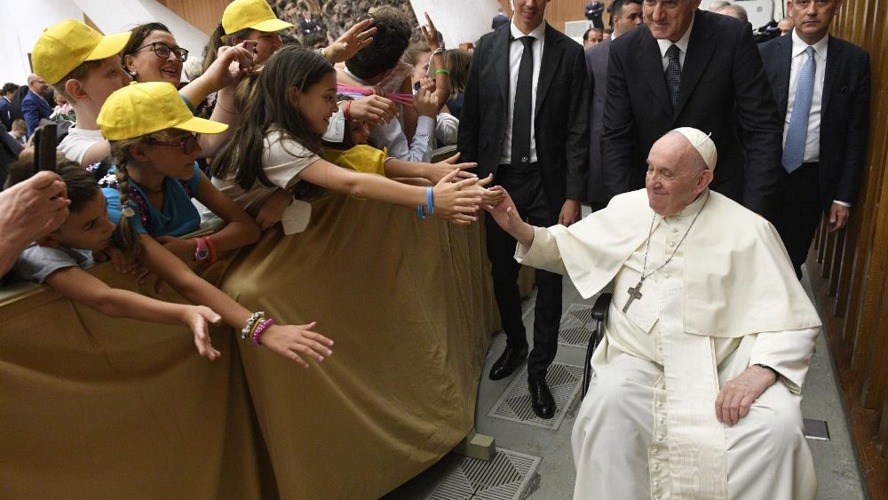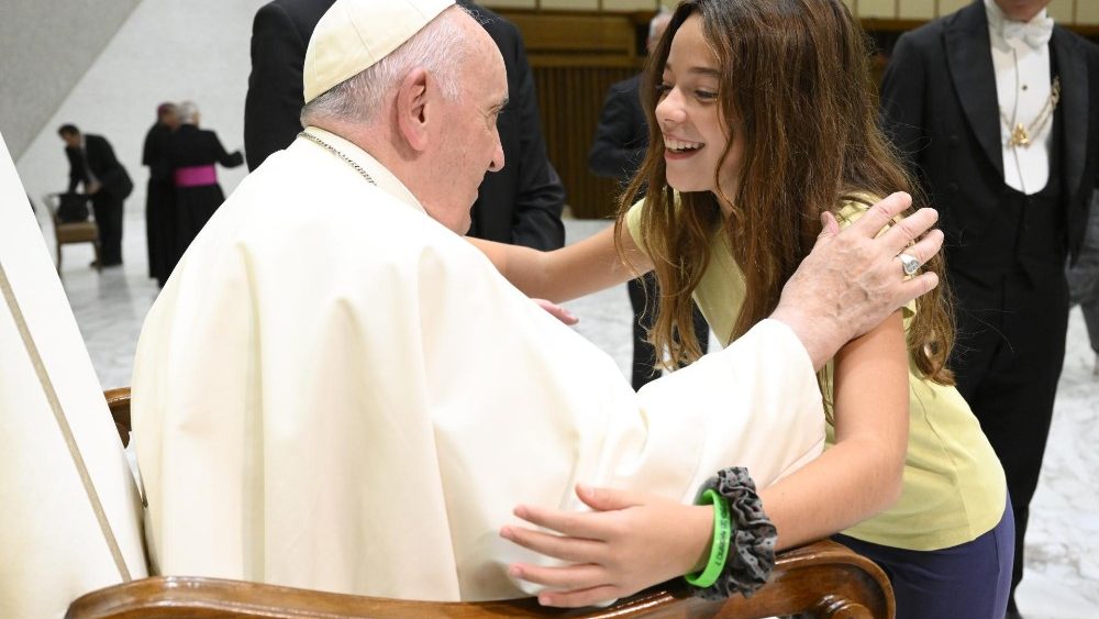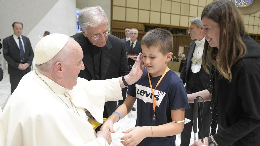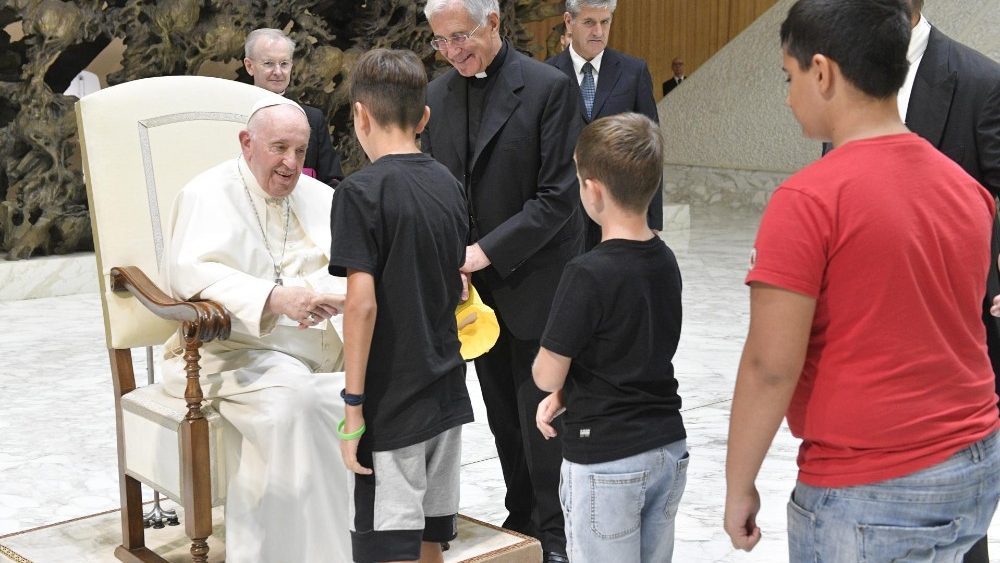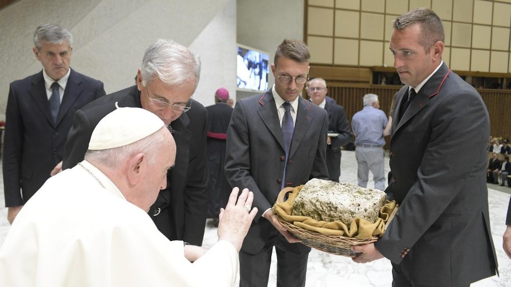 Antes de bendecir una piedra de la antigua Abadía de San Eutizio llevada por los chicos que la colocarán “como símbolo de su reconstrucción”, el Pontífice quiso bendecir también a cada uno de ellos “para que se conviertan en una piedra viva para construir la comunidad cristiana”: