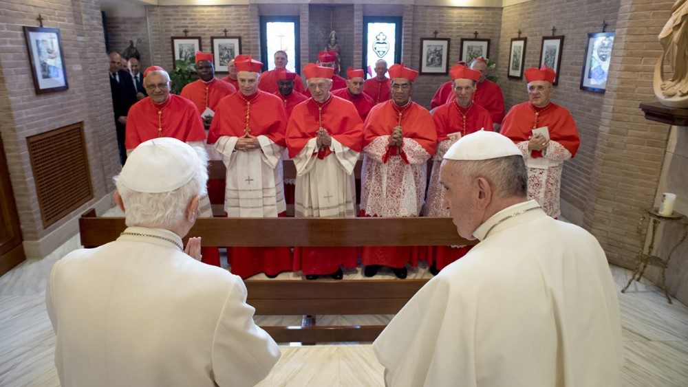 Tras el Consistorio para la creación de 13 cardenales, el Papa Francisco visitó a Benedicto XVI, acompañado por los nuevos cardenales.
