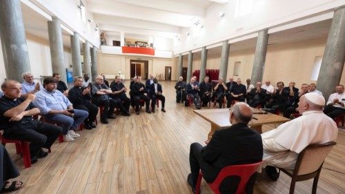Tras un café ("Gracias, así no me duermo", bromeó), atravesando el pórtico de mampostería, el Pontífice se trasladó a una pequeña sala donde, junto a los sacerdotes, recitó la oración al Espíritu Santo elegida para el año pastoral 2023-2024. Desde allí, charló con los sacerdotes que, a su vez, le hicieron preguntas. Sentado ante un escritorio, el Romano Pontífice tomó notas y respondió a cada pregunta.
