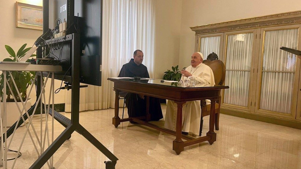 El Papa -acompañado por un traductor- está sentado ante un escritorio enla Casa Santa Marta, donde destaca el cuadro de la Virgen Desatanudos. Prepara una hoja en blanco y un bolígrafo para anotar preguntas. Saluda a los distintos rostros que aparecen entre los cuadros y dice que le impresiona especialmente una madre que sostiene a su hija pequeña, Esther: "¡Es preciosa!". La señal de la Cruz y el Padre Nuestro recitado por todos abren la reunión. El arzobispo Kulbokas leyó una lectura de la Carta de San Pablo a los Romanos, que dice: "...Nos gloriamos en la esperanza de la gloria de Dios...nos gloriamos incluso en la tribulación, sabiendo que la tribulación produce paciencia...".