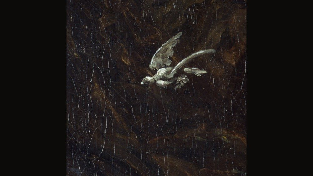 De Chirico sustituye su típico lenguaje metafísico por una representación más inmediata y narrativa, caracterizada por pinceladas borrosas y rápidos trazos de color. La energía desatada por el ritmo de la composición culmina en el vuelo ligero pero poderoso de la paloma, símbolo de esperanza que atraviesa con luz la caverna inundada de sombras.