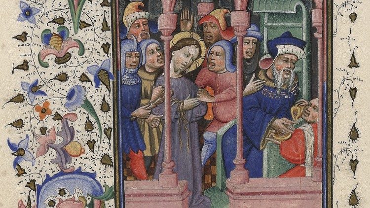 El rostro sufriente que conserva inalterada la belleza del Hijo del hombre, perseguido por la justicia, y las expresiones grotescas y enfáticas de los jefes de los sacerdotes y las autoridades que, burlándose de él, lo llevaron ante Pilato. Un contraste que se impone en la miniatura realizada en Flandes en el siglo XV por el llamado «Maestro de Guillebert de Metz» en un Libro de horas, conservado en la Biblioteca Apostólica Vaticana.