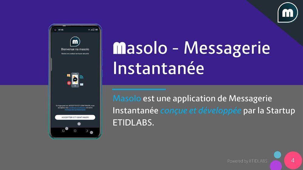 « Masolo » est une initiative d’un groupe de 5 Congolais réunis au sein de la startup ETIDLABS, spécialisée dans les domaines de l'électronique, de la télécommunication, de l’informatique et des sciences des données. L’idée principale derrière « Masolo » peut être déclinée en trois approches. Premièrement, « Masolo » est née dans le but de démocratiser la messagerie instantanée dans le contexte d’une entité estudiantine ne disposant pas d’une connexion internet fiable, mais disposant d’un réseau local Wi-Fi (cas de l’université de Kinshasa, et autres universités du pays). Deuxièmement, « Masolo » a été pensée pour lancer un business local en RD Congo autour d’une application IM, comme le font des pays comme la Chine avec « WeChat », le Japon avec « Line » ou encore la Turquie avec « Bip ». Troisièmement, « Masolo » a été pensée pour coexister avec toutes les autres applications IM présentes dans ce business.