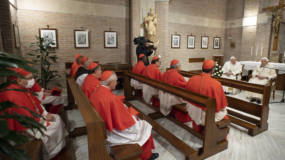 Le directeur de la Salle de Presse du Saint-Siège, Matteo Bruni, a fait savoir qu'au terme de la célébration du Consistoire de cet après-midi, le Pape François et les 11 nouveaux cardinaux présents à Rome ont rendu visite au Pape émérite Benoît XVI, dans la chapelle du monastère "Mater Ecclesiae" où il réside. Dans un climat affectueux, les cardinaux ont été présentés individuellement au Pape émérite qui a exprimé sa joie pour la visite, et, après le chant du "Salve Regina", il leur a transmis sa bénédiction. La visite s'est conclue peu après 17h.