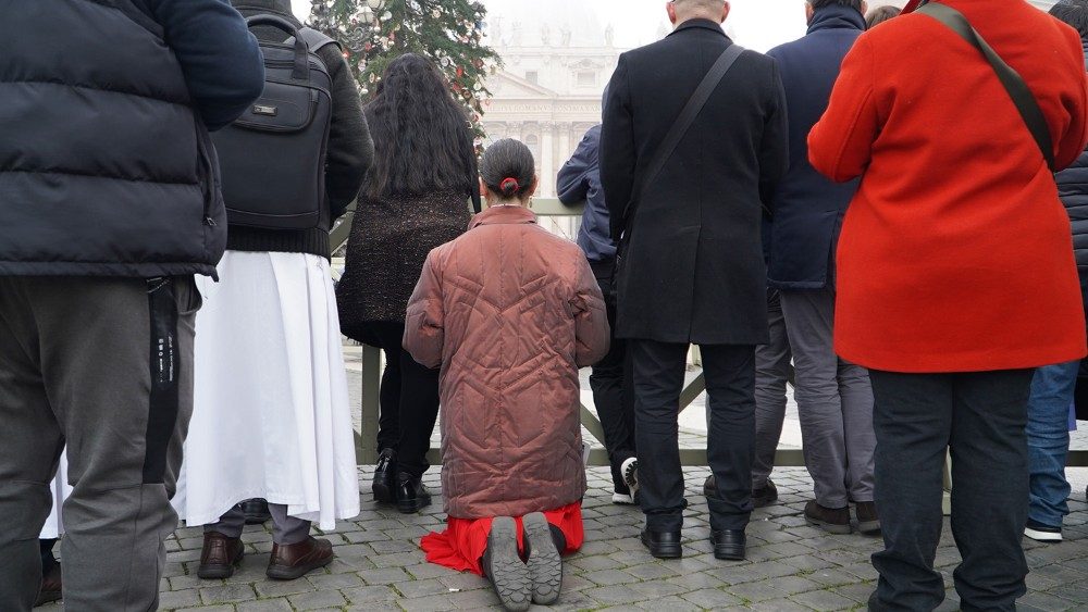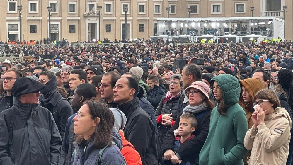 Prière, respect, silence. Trois mots pour décrire l’atmosphère priante et paisible imprégnant la place Saint-Pierre en cette matinée d'obsèques où le glas a résonné gravement après la récitation du chapelet. De la solennité à l’arrivée du cercueil et à son départ de la place sous les applaudissements des 50 000 fidèles ayant tenus à rendre hommage par leur présence au Pape émérite. L'intériorité spirituelle était de mise chez les pèlerins, certains en tenue traditionnelle de la région natale de Joseph Ratzinger, la Bavière, mais aussi d'Autriche. Il y avait beaucoup de fidèles polonais, et de langue anglaise. À noter la forte présence de prêtres et religieux venus rendre saluer le Pape théologien, qu’ils considéraient comme un véritable père, et qui, chez beaucoup, a déclenché une vraie vocation d’entrer dans les ordres. Des paroissiens venus de France, du Luxembourg, Martinique même, quelques familles individuelles avec enfants, beaucoup de groupes de jeunes français essentiellement du Sud de la France.