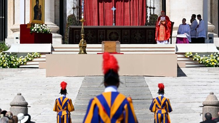 Premier acte, le cercueil de bois de cyprès et de zinc porté par 14 sediari pontificaux entouré des 220 cardinaux concélébrant en habit liturgique rouge avance lentement à l’intérieur de la basilique Saint-Pierre. Sous les applaudissements résonnant jusqu’au château Saint-Ange, les notes du requiem éternel s’envolent dans le ciel. Le cercueil du Pape défunt est déposé au sol sur le parvis fleuri, devant l’autel, près du cierge pascal or et bleu roi. Ce même endroit où il était assis chaque mercredi lorsque le temps était clément pour les audiences générales. Le cercueil est recouvert de l’évangéliaire. S’élance la procession des cardinaux et patriarches, qui ont entre leurs mains la responsabilité de la continuité du gouvernement de l’Église pendant la vacance du Siège apostolique. Ces hommes de 45 à 91 ans, âge du doyen présidant la célébration, en pourpre teinté d’or, confèrent à la place toute sa solennité ecclésiale.