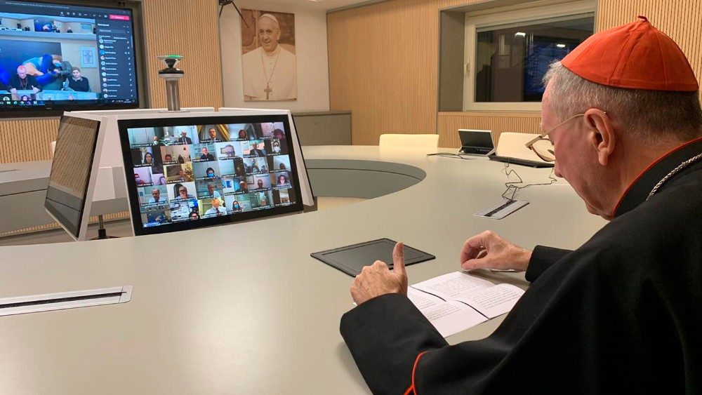 «Nous remercions Dieu qu'il y ait ces moyens qui nous permettent de rester en contact malgré la pandémie» a dit le cardinal en regardant par écrans interposés les médecins, les infirmières et les religieux connectés via internet. «La pandémie a réduit les possibilités de notre réunion, mais j'aurais été désolé de ne pas pouvoir renouveler ce rendez-vous traditionnel. Je salue et embrasse un par un ceux qui sont connectés et j'apporte aussi avec moi la salutation et l'étreinte du Pape François», a expliqué le Secrétaire d’État.