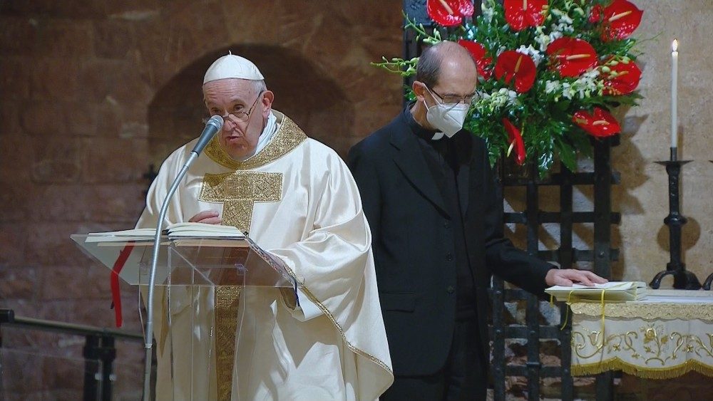 असीसी में ख्रीस्तयाग अर्पित करते संत पापा फ्राँसिस जिन्होंने वहाँ अपने नये विश्व पत्र पर हस्ताक्षर किया