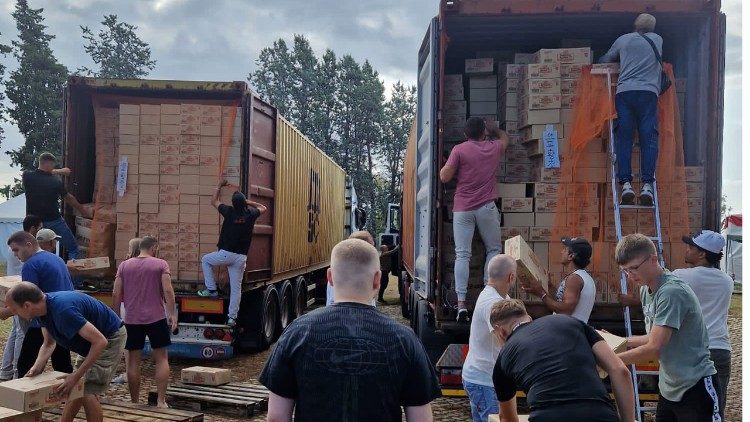 यूक्रेन के युद्ध पीड़ितों के लिए खाद्य सामग्री को ट्रक में लॉड करते हुए यूक्रेन के युद्ध पीड़ितों के लिए खाद्य सामग्री को ट्रक में लॉड करते हुए