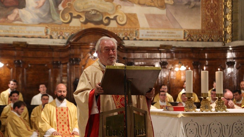 Rektor Đurin zahvalio je posebno p. Mihályu Szentmártoniju, SJ, na dolasku i na poticajnim riječima koje je uputio nazočnima. Ujedno mu je čestitao 50. obljetnicu svećeništva, istaknuvši kako su obljetnice i jubileji prigode za zahvaliti Bogu. „Velik dio od tih 50 godina svoga svećeničkog života i rada ostavili ste ovdje u Rimu, na Papinskom sveučilištu Gregoriana kao profesor, dvadesetak godina kao duhovnik u našem Zavodu, nekoliko godina kao odgojitelj u Zavodu Germanicum et Hungaricum, zatim kao suradnik Dikasterija za kauze svetih, duhovnik tolikih drugih rimskih svećeničkih zavoda te brojnih zajednica naših časnih sestara. Održali ste, i Bogu hvala još uvijek održavate, tolike duhovne vježbe, duhovne obnove, nagovore. Hvala Vam na svemu tome. Hvala Vam što postojite, tako ste nam to često baš Vi znali reći, i što je dragi Bog učinio da se Vaš životni put spojio s našim životnim putevima. Neka Vam dobri Bog i dalje dade snage i mudrosti da mognete nastaviti Vaše poslanje i uvijek ovako vedri i radosni govoriti i svjedočiti drugima o Njemu.“
