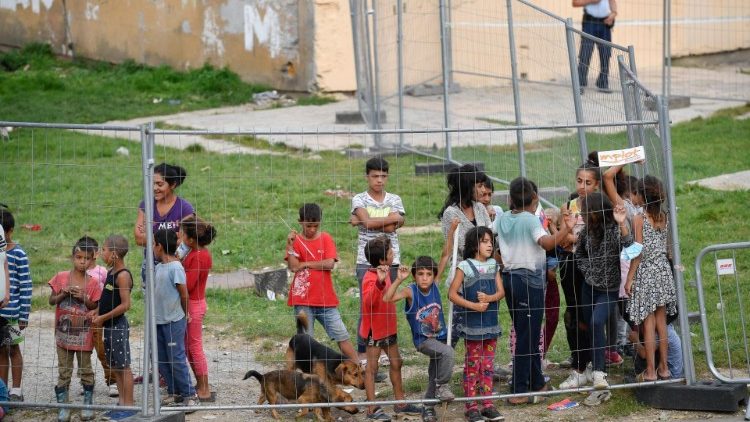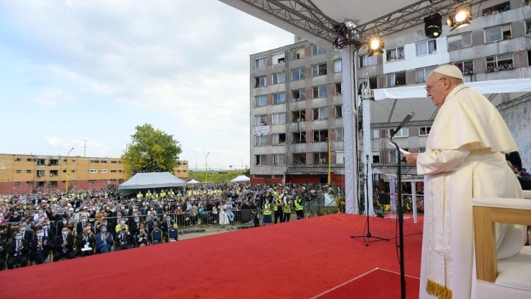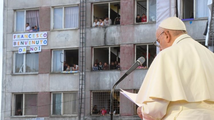 Francesco, Isten hozott nálunk! Ezzel az olasz nyelvű színes felirattal várták a gyerekek a pápát, a kopott szürke, düledező emeletes házak előtt, amelyet otthonuknak tudnak. Cigány zene és dörgő taps fogadta a Szentatyát, az ablakokból kihajoló emberek boldogan ünnepelték az illusztris vendéget, aki megtisztelte őket látogatásával. Egy fehér emelvényt állítottak föl a füves területen, ahol a pápa a beilleszkedést nevezte meg a békés együttélés egyetlen lehetséges útjának. Az ítélkezés, az előítéletek, a gettóba zárás semmit nem old meg.