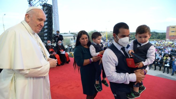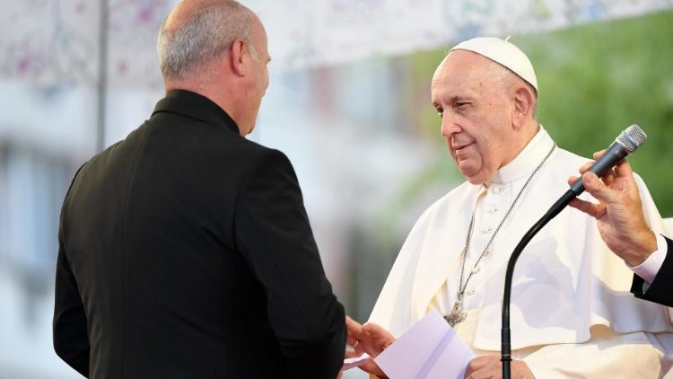 Két roma házaspár tanúságtételét hallgatta meg a pápa, akire nagy hatást tett családszeretetük, az elszenvedett előítéletek, a kirekesztés és a mélyszegénység mindennapos gondjai. „Ti otthon vagytok az egyházban, senki ne tartson benneteket távol az egyháztól! – buzdította őket. Az egyházban mindenkinek helye van, egymás testvérei vagyunk, Isten azt akarja, hogy az egész emberiség egy egyetemes család legyen. Még a keresztényeknek sem könnyű túllépni az előítéleteken – állapította meg a Szentatya. Ehhez meg kell ismerni a másik embert, nem szabad ítélkezni, ahogyan arra Jézus tanított minket. A romák túl sokszor szenvedtek az előítéletektől, a megbélyegzéstől, a rágalmazó gesztusoktól. Mindez emberileg csak szegényebbé tett minket. Ahhoz, hogy visszaszerezzék méltóságukat, párbeszédet kell indítani, kilépni az elszigeteltségből, és a beilleszkedést választani. Ehhez pedig tanulni kell, munkát vállalni, ahogyan azt Nikola és René tették. Idővel a türelem, a kitartás, a lelkipásztori munka meghozza gyümölcsét – biztatott Ferenc pápa.