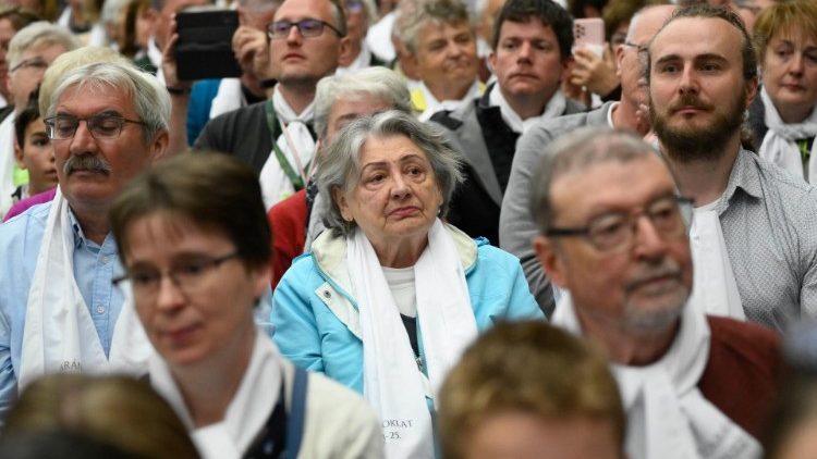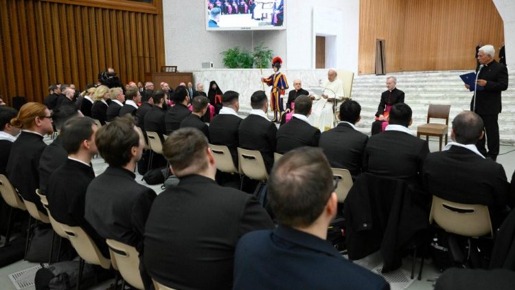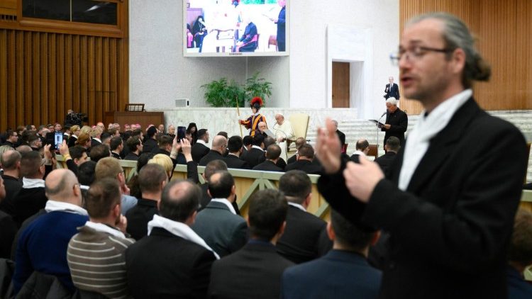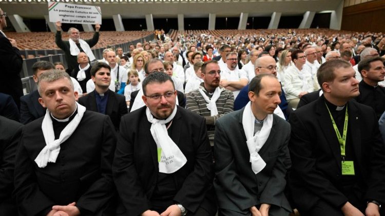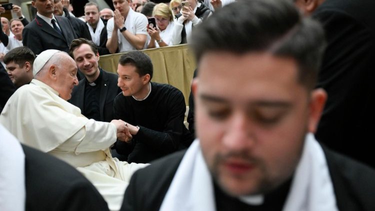 A Szentatyának csütörtökön délelőtt nagyon sűrű volt a programja, így már vitték is volna a következő találkozóra, de amikor látta az első sorban ülő szeminaristákat, diakónusokat és többségében fiatal papokat, jelezte a kíséretének: „Io vorrei andare alla gente! Szeretnék az emberekhez menni!” és közel negyed órát töltött köztük.