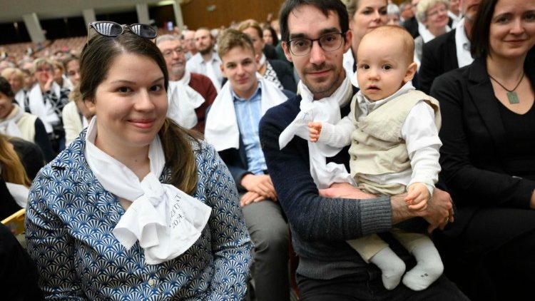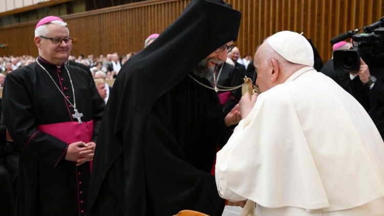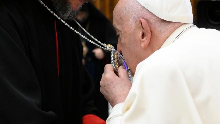 A mintegy fél órás megbeszélés után került sor a kölcsönös megajándékozásra, majd az elnök úr a kíséretével, utána pedig maga a Szentatya érkezett a VI. Pál kihallgatási aulába, ahol a püspöki konferencia tagjai, a mintegy kétszáz fős papság és a közel másfélezer hívő lelkes tapssal köszöntötte Ferenc pápát.