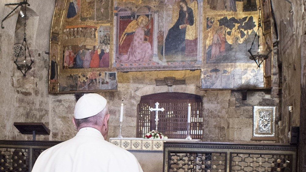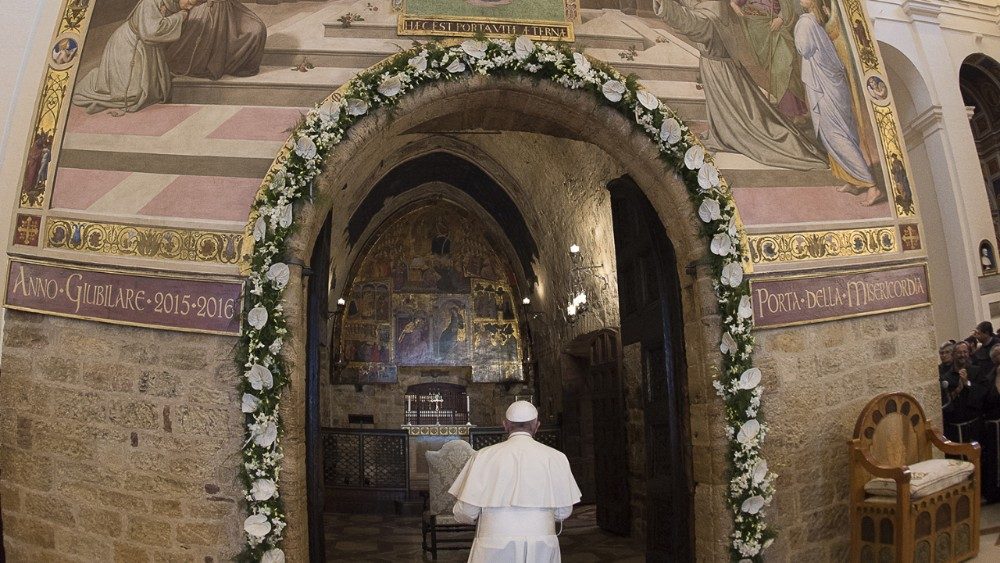 Come ogni anno, nei primi due giorni di agosto, Assisi è una sorta di capitale mondiale della misericordia per la festa del Perdono che inizia la mattina del primo agosto e si conclude la sera del giorno seguente. La Porziuncola, minuscola chiesa nella basilica di Santa Maria degli Angeli, è da otto secoli fonte inesauribile di perdono. La sua storia è indissolubilmente legata al 2 agosto del 1216. E’ notte e San Francesco è immerso nella preghiera. Vede sopra l’altare il Cristo e sua Madre, circondati da una moltitudine di Angeli. Francesco rivolge allora al Padre questa preghiera: “Ti prego che tutti coloro che, pentiti e confessati, verranno a visitare questa chiesa, ottengano ampio e generoso perdono, con una completa remissione di tutte le colpe”.
