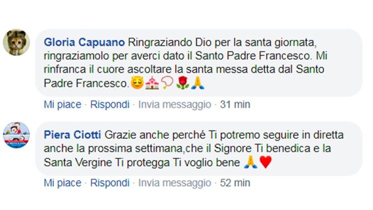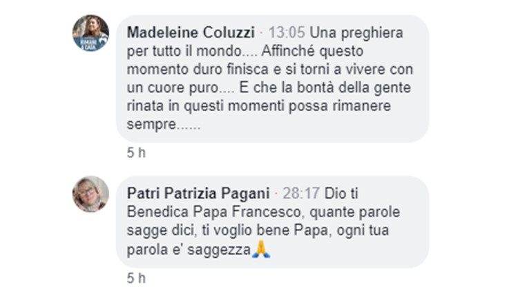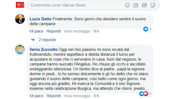 Prosegue l'appuntamento quotidiano dalla Basilica di San Pietro con il Regina Coeli ed il Rosario recitati dal cardinale Angelo Comastri, Vicario di Sua Santità per lo Stato della Città del Vaticano. Ogni giorno numerosi fedeli ci scrivono, anche attraverso i social, per pregare insieme in un momento così particolare qual è questo tempo di pandemia. Ecco alcuni messaggi dalla pagina Facebook di VaticanNews. (AdA)