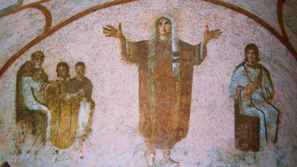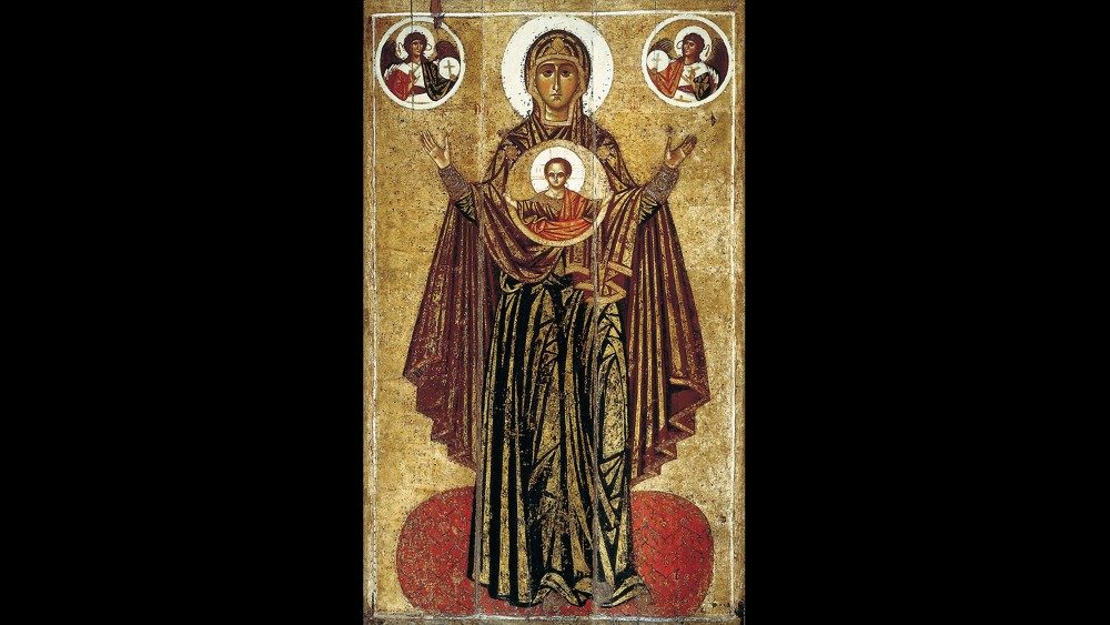 L’icona prototipica è la cosiddetta Platytera o Blachernitissa, raffigurata nella Basilica di Costantinopoli. È nota come Vergine del Segno: ha le braccia aperte e reca, al centro della sua figura, il Bambino benedicente. “La Madre del Segno – spiega a Vatican News l’iconografo don Gianluca Busi, parroco e docente alla Facoltà Teologica dell’Emilia Romagna - fonde due modelli: il primo deriva dalle Catacombe di Priscilla ed è quello della cosiddetta “orante”. Si tratta di una figura vestita in porpora con le mani alzate a forma di “U” in segno di preghiera. Il secondo modello sembra essere la veggente dei misteri eleusini”, i riti religiosi misterici che si celebravano ogni anno nel santuario di Demetra nell'antica città greca di Eleusi.