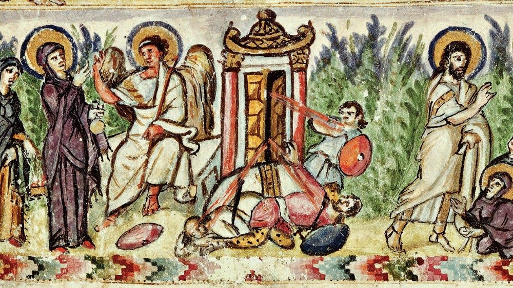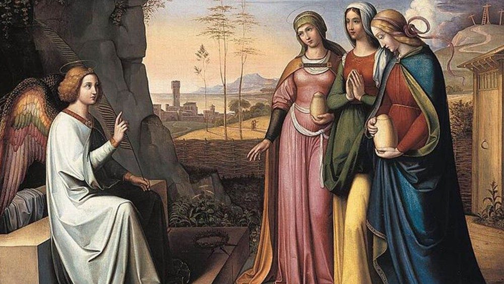 La giornata si apre con la scoperta della tomba vuota, la mattina presto, da parte delle donne e di Maria Maddalena, recatesi con gli aromi per onorare il defunto: incontrano uno o più angeli, portatori di un annuncio sconvolgente. A rappresentare magistralmente gli occhi femminili increduli, ancora gonfi di lacrime, nel 1890 è il pennello di William Adolphe Bougueraeau. Composto e pacato lo stupore delle mirofore nella tela datata 1815 di Peter Von Cornelius della Neue Pinakothek di Monaco di Baviera. Successivamente è il Risorto stesso ad apparire ad alcune donne, o secondo altri racconti solo a Maria Maddalena che, riconosciutolo, tenta di abbracciarlo, fermata nel suo slancio dal celebre ‘Noli me tangere’. La scena è inserita da Jan Brughel il Giovane nel 1630 all’interno di un giardino brulicante di ortraggi di ogni genere.