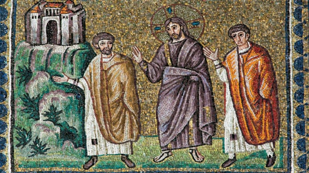 Segue la corsa della donna ad annunciare la notizia agli apostoli, con Pietro e Giovanni che decidono di andare a verificare e scoprono il sepolcro vuoto. Vibrante di emozione è l’olio di Eugène Burnand: lo sguardo dei due uomini rivela incredulità, speranza, impazienza di toccare con mano quanto ascoltato. L’esperienza eccezionale dei discepoli di Emmaus è il quarto incontro, illustrato dai mosaici realizzati nel VI secolo a Sant’Apollinare Nuovo a Ravenna. I due lungo la strada conversavano di tutti gli incredibili eventi delle ultime ore e si ritrovano, senza riconoscerlo in un primo momento, a parlare e cenare proprio con Lui: il Risorto.