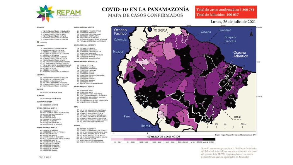 Le cifre ufficiali diffuse il 26 luglio, parlano di 100.037 morti e 3.500.761 persone infettate dal Covid-19 in Panamazonia, area che comprende i territori di Bolivia, Brasile, Colombia, Ecuador, Guyana, Guyana francese, Perù, Suriname e Venezuela. Purtroppo, si presume che di vittime ce ne siano molte di più, date le difficoltà di accesso alle informazioni e alle modalità di registrazione e trasmissione dei dati di ciascuno dei Paesi coinvolti. I dati si riferiscono a partire dal 17 marzo 2020, quando si registrarono i primi 24 casi e il primo decesso.