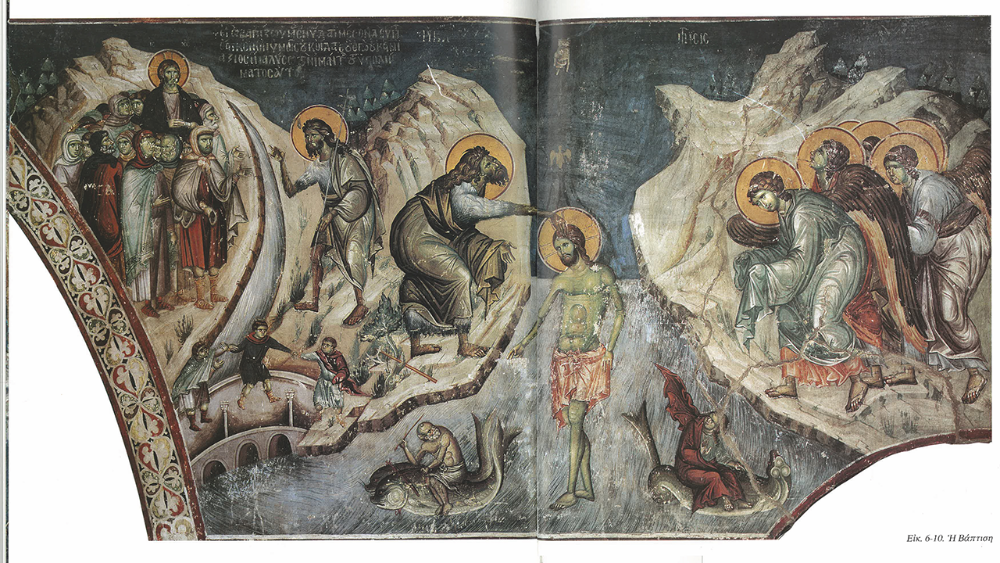 Particolarmente significativi sono gli affreschi realizzati da Manuele Panselinos nei primi anni venti del XIV secolo all’interno della chiesa di Protaton sul Monte Athos in Grecia. La composizione è suddivisa in più tappe: sulla sinistra la figura di Cristo di dimensioni maggiori rispetto ai peccatori che con lui attendono di immergersi nel fiume. Rarissima la scena dei bambini che giocano e ricordano il sacrificio degli innocenti. Al centro il cuore del racconto evangelico: il Battista non guarda il Cristo, ma il cielo da cui discendono la colomba dello Spirito Santo e la mano di Dio. Ampio risalto è dato dal celebre iconografo alla natura, con i delfini che nuotano in mezzo alle acque, probabilmente osservati nei pressi della sacra montagna. Sulla destra le figure degli angeli che attendono con i teli il Figlio di Dio.