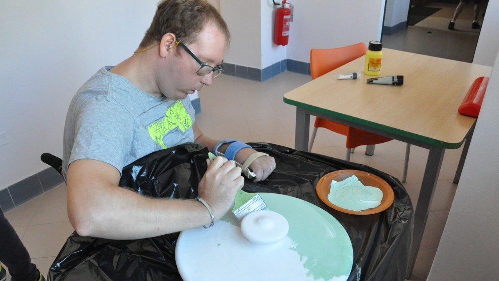 Sono stati i giovani ospiti dell’Istituto Serafico di Assisi a dipingere la giara posizionata davanti al palco del Teatro Lyrick nei giorni di Economy of Francesco. Spicca una grande margherita disegnata al centro e i colori che ricordano la natura. Sul tappo, invece, sono impresse le orme delle mani degli autori-artisti, quasi a sugellare l’impegno per l’avvenire, con attenzione particolare a quanti – come loro – vivono una diversa abilità.