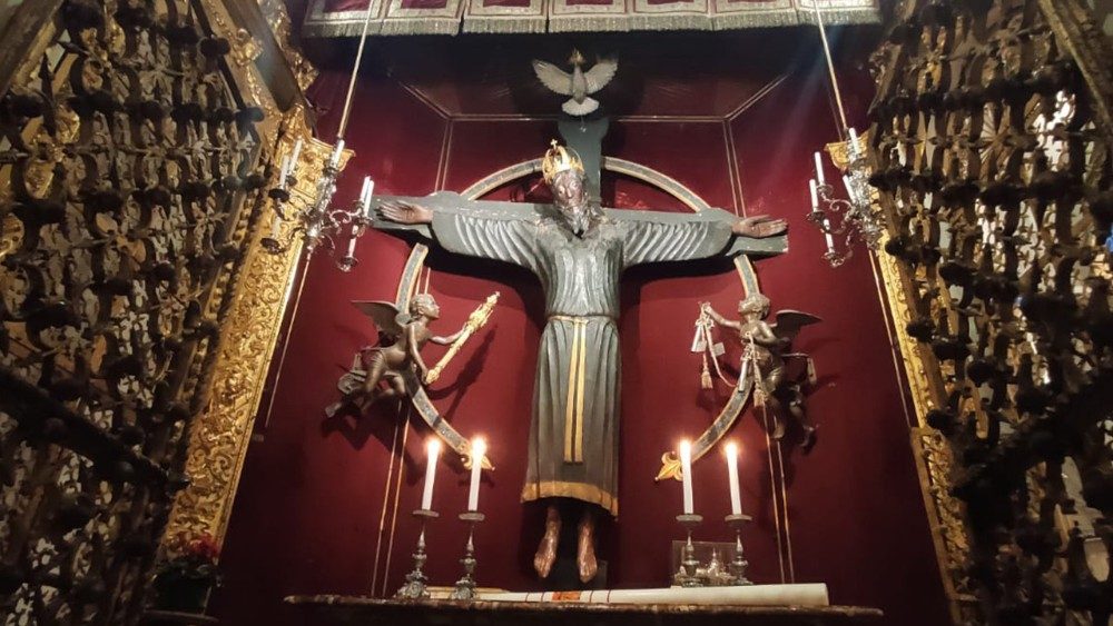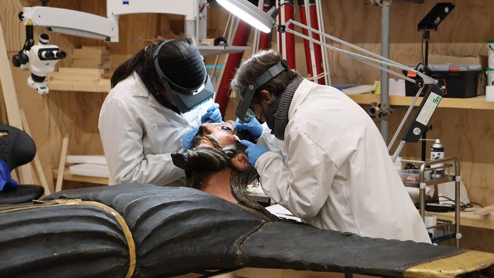 Da due anni, esattamente dal 1° dicembre 2022, si trova nel laboratorio allestito nel transetto nord della cattedrale di San Martino, affidato alle cure dei restauratori; i visitatori possono assistere alle varie fasi degli interventi da dietro un vetro. Vederlo disteso, ad altezza d’uomo, spinge a un forte sentimento di tenerezza: è come se il Crocifisso fosse tornato Bambino nella culla del Natale.