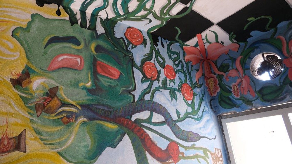 L’opera occupa un’intera sala molto grande: tutte e quattro le mura e il soffitto a volta, tanto che per essere realizzata è stato necessario un ponteggio. “Vi sono dipinti molti elementi caratteristici di Napoli – prosegue Kuczynski – ad esempio Partenope, la sirena che si dice abbia fondato la città, poi una coppia che lotta nel mare in tempesta aiutandosi reciprocamente, a ricordare che nessuno si salva da solo; c’è anche una parte sulla propria infanzia in cui hanno trovato spazio simboli delle proprie paure, dei propri fantasmi, e perfino l’immagine di un pavimento che si apre da cui fuoriescono orologi, a simboleggiare che un giorno nuovo può sempre arrivare”.