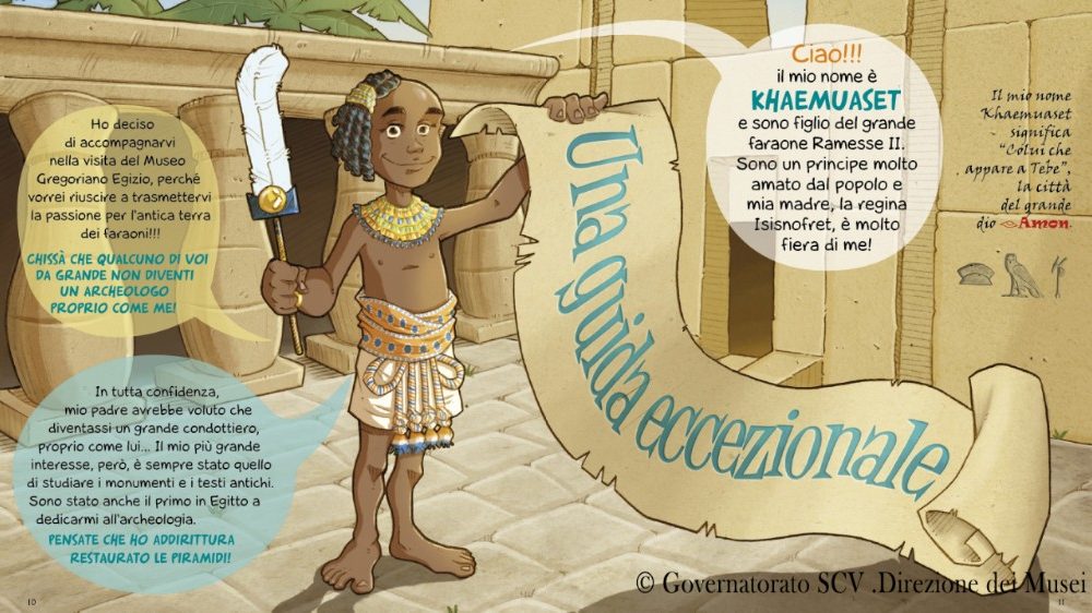 Non capita tutti i giorni di avere per guida uno dei primi archeologi della storia, Khaemuaset, che ha persino restaurato le Piramidi. Eppure questo avviene nelle pagine del libro curato da Alessia Amenta, la studiosa a capo del Reparto Antichità Egizie. Un percorso pensato per i bambini dagli otto anni in su, “fino ai 99”, è stato detto scherzosamente –ma in fondo non troppo – durante la presentazione ai Musei Vaticani. Perché il volume, in effetti, pur rivolto ai ragazzi, con illustrazioni, schede esplicative, contenuti che sfidano la tridimensionalità, è frutto di un lavoro durissimo, durato tre anni, e si presenta anche come un valido supporto per chi debba spiegare la cultura egizia alle nuove generazioni.