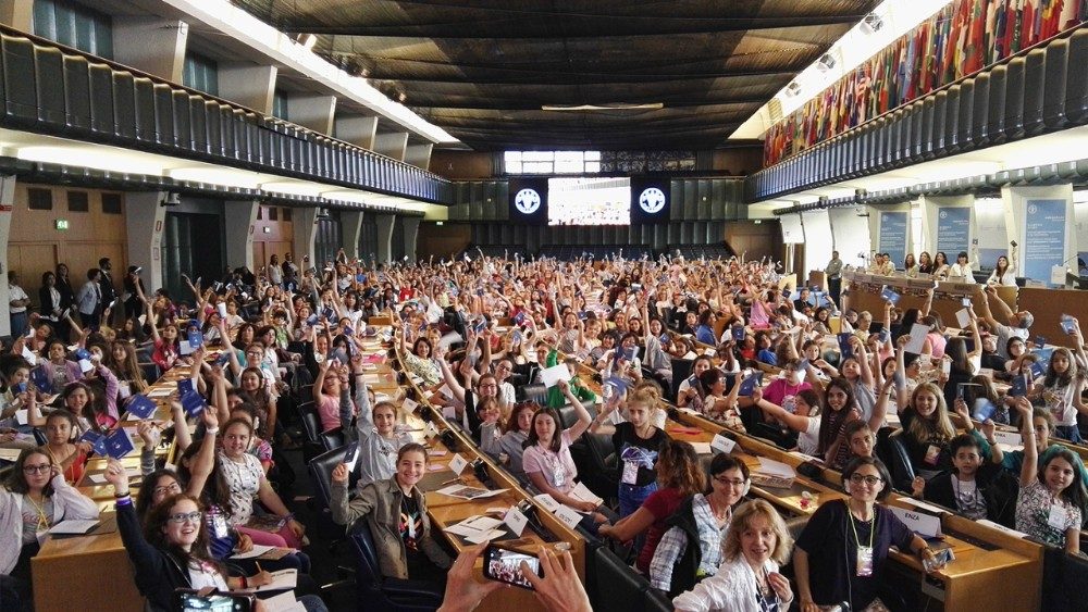 630 ragazze, dai 9 ai 14 anni, del Movimento dei Focolari, provenienti da 17 nazioni, hanno riempito venerdì scorso la prestigiosa sala Plenaria dell’Organizzazione delle Nazioni Unite per l'alimentazione e l'agricoltura (FAO), nella sede di Roma. Una rappresentanza delle adolescenti del Movimento, chiamate anche gen 3. E in collegamento live streaming hanno seguito l’evento giovanissimi sparsi nei cinque continenti, in particolare 400 coetanei riuniti in congresso a Loppiano in Toscana, la Cittadella internazionale dei Focolari.
