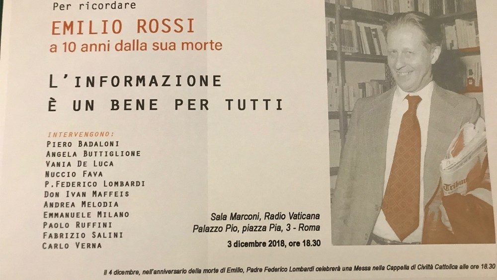 Un ricordo di Emilio Rossi denso di emozione e ricco di spunti di riflessione per fare oggi una buona informazione. E' stato tracciato, ieri pomeriggio, presso la sede di Palazzo Pio, a Roma, dal convegno: "Per ricordare Emilio Rossi a 10 anni dalla sua morte. L'informazione è un bene per tutti". A susseguirsi testimoni della parabola professionale e umana di Emilio Rossi: da primo direttore del Tg1, dopo la riforma del 1975, a vice direttore generale della Rai, da presidente dell'Unione Cattolica Stampa Italiana fino alla guida del Comitato di Amministrazione del Centro Televisivo Vaticano e del Comitato tv e minori.