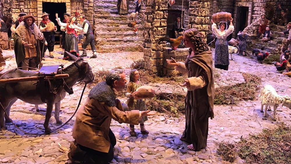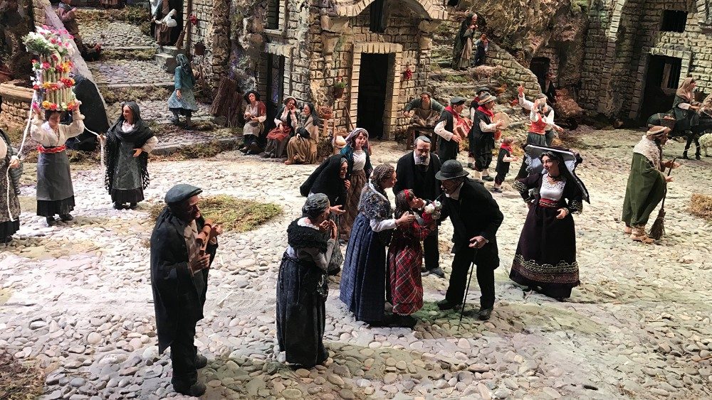Una Natività nel cuore dei Sassi di Matera Patrimonio dell’Umanità,  con Maria la madre in piedi che mostra il Figlio al mondo, un Gesù Bambino con le braccia allargate come se volesse abbracciare l’umanità intera, e accanto a loro Giuseppe in atteggiamento di preghiera che osserva la scena. È questo il cuore del Presepe ospitato quest’anno al palazzo del Quirinale e allestito dalla Regione Basilicata, che l’anno prossimo sarà protagonista con Matera proclamata Capitale Europea della cultura 2019.
