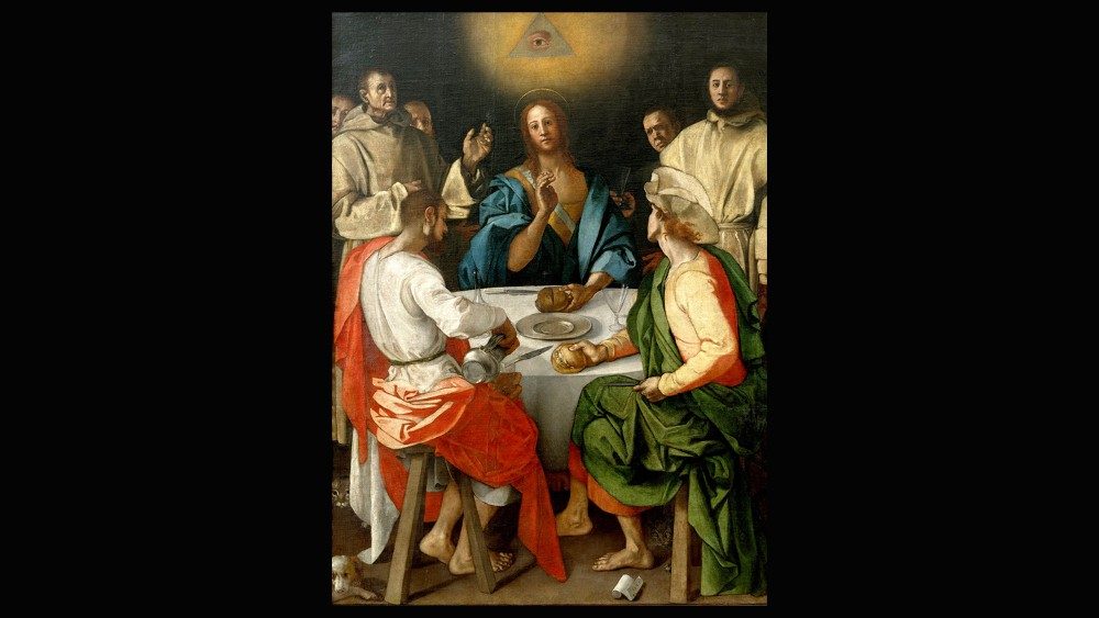 Infine nel giorno del Lunedì dell’Angelo gli Uffizi portano a casa dei visitatori digitali la manifestazione del Risorto agli increduli discepoli di Emmaus. L’opera scelta è la Cena in Emmaus del Pontormo. E’ una delle tele più note del pittore cinquecentesco, esponente del primo manierismo fiorentino. Eike Schmidt ci mostra subito un dettaglio, l’occhio di Dio nella parte superiore della composizione: in realtà “non ha nulla a che vedere con Pontormo, è un elemento ridipinto, ma lasciato nel quadro per non snaturarne la storia”. Ciò che invece intenzionalmente il pittore vuole comunicare è la dimensione dell’incarnazione di Gesù, non un Dio lontano, non un Deus absconditus, ma un Dio fatto uomo, vicino alle vicende di ogni creatura. “Colpiscono il cane e il gatto ai piedi dei commensali. Queste figure – aggiunge il direttore delle Gallerie - creano intimità, invitano lo spettatore a far entrare Cristo nella vita quotidiana”.