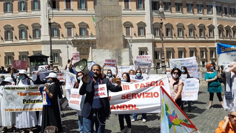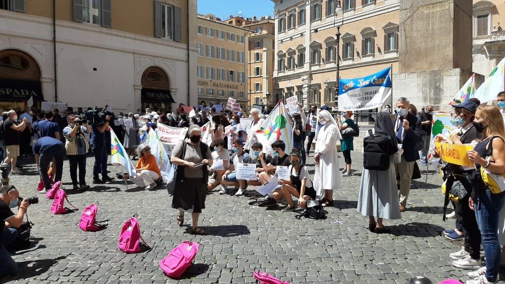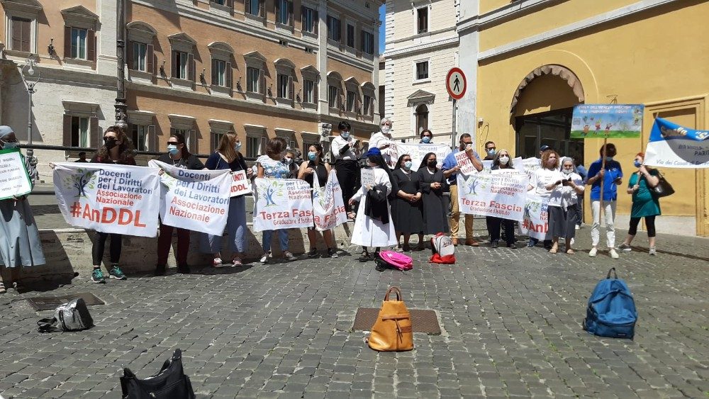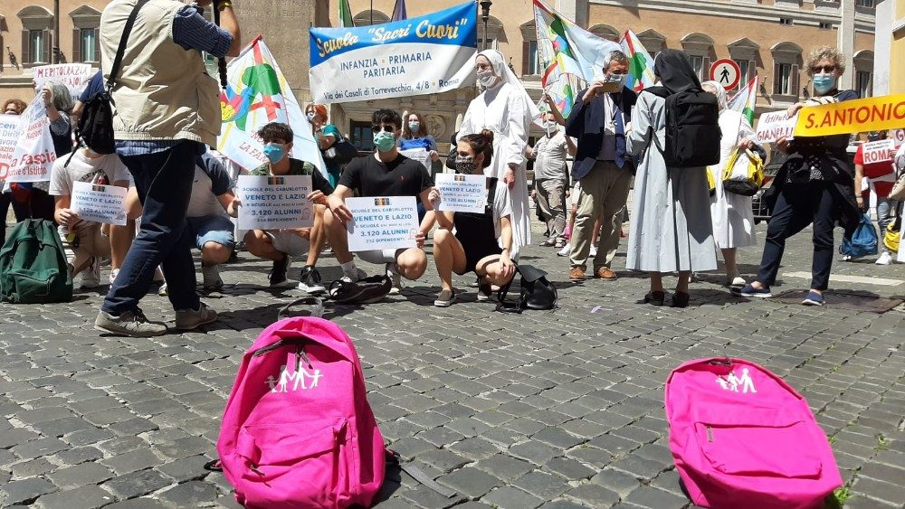 Sulla piazza antistante la Camera dei Deputati è stata posta una fila di zainetti rosa a simboleggiare la concreata possibilità che centinaia di migliaia di alunni possano rimanere senza la garanzia del diritto allo studio e alla libertà educativa dal prossimo settembre. Le Conferenze dei religiosi e delle religiose in Italia, Cism e Usmi; le associazioni dei genitori, Age e Agesc; i gruppi pro family italiani 'Non si tocca la Famiglia', 'Pro Vita e Famiglia' e 'Family Day' hanno ribadito la richiesta di prevedere un aumento degli attuali 150milioni di euro, stanziati per le paritarie nel decreto rilancio.