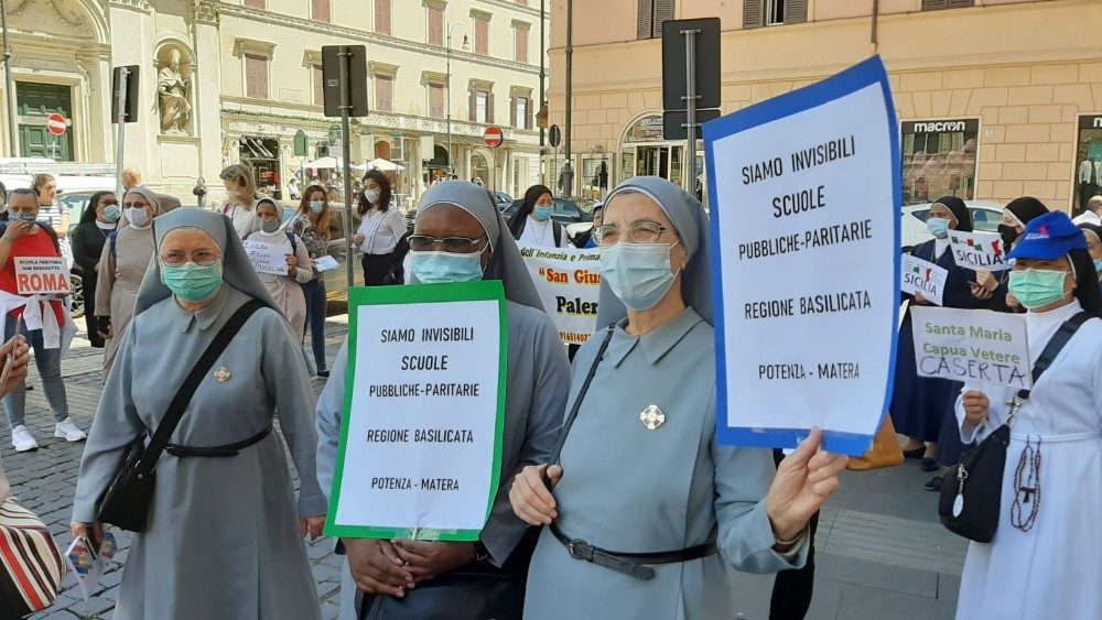 Al tal proposito, suor Anna Monia Alfieri, rappresentate nazionale di Cism e Usmi, ha ricordato che secondo la legge 62 del 2000, il sistema nazionale di istruzione è composto sia dalla scuole statali che dalle paritarie ed entrambe svolgono un servizio pubblico. La religiosa, intervenuta alla manifestazione, ha spiegato che avere il 30% per cento delle paritarie a rischio chiusura significa lasciare in strada 300mila alunni e che perdere questo comparto allo Stato costerebbe 2,4 miliardi di euro. “Il governo sa bene che, soprattutto in tempi di Covid, le 40mila scuole statali non possono accogliere l’utenza delle 13mila scuole paritarie”, ha chiarito suor Monia che poi ha messo a fuoco anche diversi rischi sociali: “non ripartire con la scuola significa consegnare i ragazzi del sud alla mafia e alla camorra e se non riparte il comparto 0-6 anni significa costringere le donne delle aeree più svantaggiate a rinunciare al lavoro e all’emancipazione”.