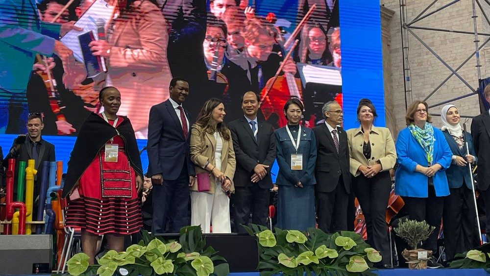 Sul palco allestito davanti alla Basilica inferiore di San Francesco, gli inni nazionali vengono suonati da tre band inclusive con 80 musicisti di cui 50 con disabilità. Accanto alle dichiarazioni dei ministri, per oltre due ore si intrecciano le esperienze di tanti ragazzi con disabilità. Ogni storia è espressione di determinazione, tenacia, coraggio per affermarsi e per affermare il diritto allo studio, al lavoro e all’inclusione. Storie che non vanno guardate con pietà ma con ammirazione e rispetto. Colpisce quella di Paolo Puddu, giovane di Cagliari: la sua voce è quella di Simona che lo accompagna, i pensieri sono frutto della lettura di una tavoletta trasparente dove sono incise le lettere dell’alfabeto con le quali formula il proprio pensiero, profondo e toccante. Si è laureato in lettere, è dirigente dell’associazione bambini cerebrolesi ABC.