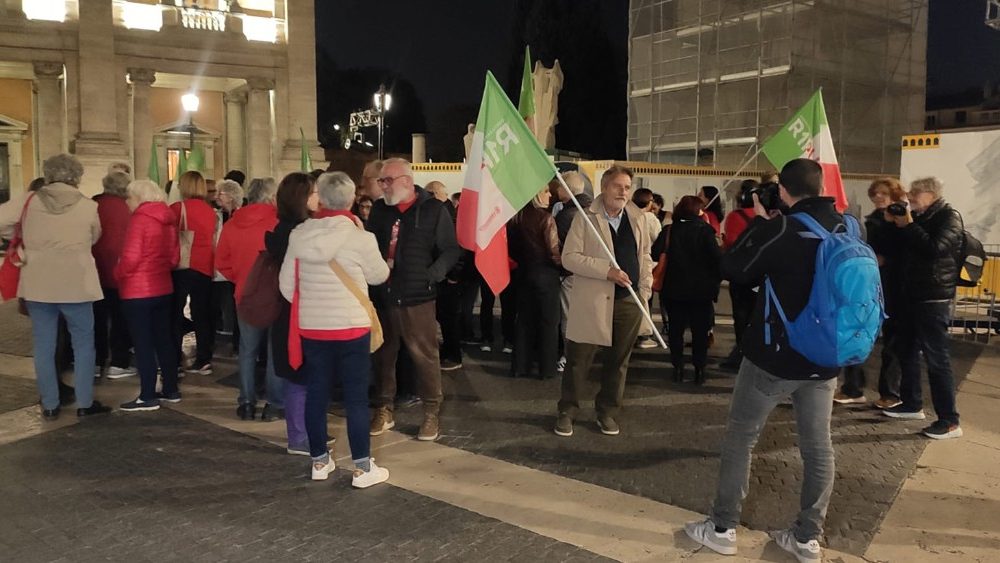 La scalinata che porta al Campidoglio brilla colpita dagli ultimi raggi del sole al tramonto, mentre sulla piazza iniziano a riunirsi gruppi di cittadini che sventolano bandiere in favore della pace. Il messaggio è chiaro: Roma ripudia la guerra e lo comunica proiettando sulla facciata del Palazzo Senatorio la parola ‘R1pud1a’, "con i numeri al posto delle lettere, non una scelta casuale”, spiega Giuliano Battiston, editorial manager di Emergency, l'associazione che ieri sera a Roma ha organizzato una manifestazione contro i conflitti. "Dopo la Seconda Guerra Mondiale venne scelto questo termine all’interno dell’articolo 11 della Costituzione Italiana per dare un accento più energico al messaggio di condanna della guerra. Noi vogliamo recuperare questo valore fondante della nostra storia”.