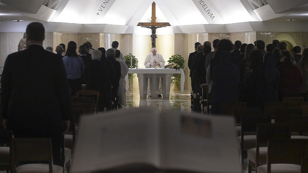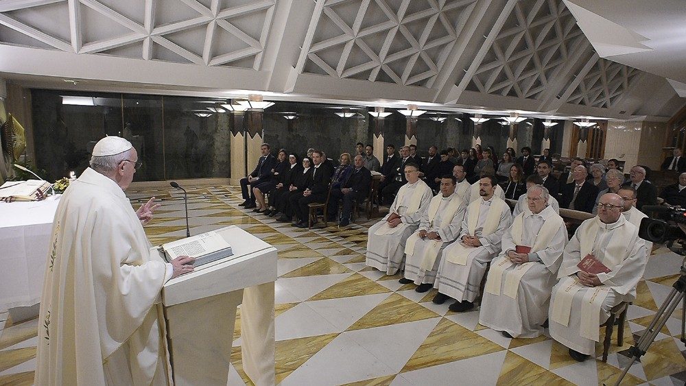 Pensiamo un po’: qual è l’atmosfera spirituale della mia vita? Sono attento, ho bisogno sempre di qualcuno che mi dica la verità, o no, credo di no? Ascolto il rimprovero di qualche amico, del confessore, del marito, della moglie, dei figli che mi aiuta un po’? Guardando questa storia di Davide – del Santo re Davide – chiediamoci: se un Santo è stato capace di cadere così, stiamo attenti, fratelli e sorelle, anche a noi può accadere. Anche, domandiamoci: io in quale atmosfera vivo? Che il Signore ci dia la grazia di inviarci sempre un profeta – può essere il vicino, il figlio, la mamma, il papà – che ci schiaffeggi un po’ quando stiamo scivolando in questa atmosfera dove sembra che tutto sia lecito.