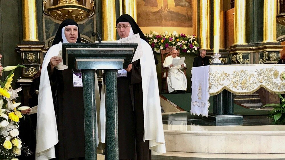 “La vita di clausura non imprigiona né restringe il cuore, ma piuttosto lo allarga grazie alla relazione con il Signore”; le religiose con un cuore ristretto, le collezioniste di ingiustizie tornino a far respirare il proprio cuore e tornino a essere madri. Papa Francesco, nell’omelia, condivide questa riflessione con le religiose peruviane di vita contemplativa che incontra nel Santuario del Señor de los Milagros per la preghiera dell’Ora Media. Il luogo sacro, gestito dalle Madri Nazarene Carmelitane Scalze, è, insieme con il Monastero, un complesso religioso situato nel centro storico di Lima ed è dedicato al culto del Patrono del Perù, il Signore dei Miracoli. Il dipinto su muro del XVII secolo, raffigurante la Crocefissione di Cristo, è rimasto illeso al devastante sisma del 1655, che rase al suolo gran parte degli edifici della capitale.