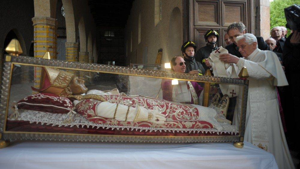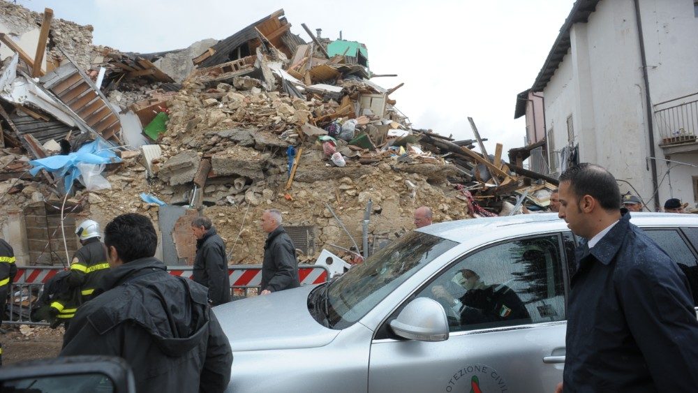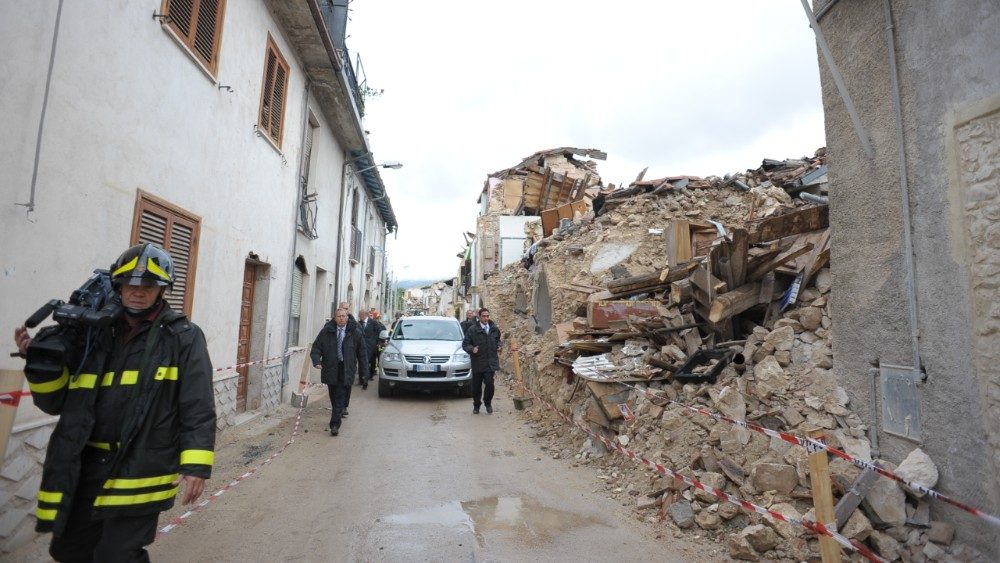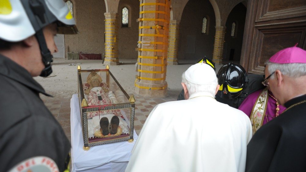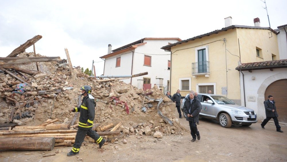 E in questa terra, che ancora mostra le ferite del sisma, si è recato il 28 aprile del 2009 Papa Benedetto XVI per incontrare le popolazioni scosse dal terremoto. Tra le tappe di quella toccante visita, la preghiera nella Basilica di Collemaggio, la venerazione dell'urna di Papa Celestino V, la sosta presso la Casa dello studente - uno dei luoghi simbolo del sisma - e l’incontro con il personale impegnato nei soccorsi. “Ora - aveva detto Papa Benedetto visitando la tendopoli di Onna - sono qui, tra voi: vorrei abbracciarvi con affetto uno ad uno. La Chiesa tutta è qui con me, accanto alle vostre sofferenze, partecipe del vostro dolore per la perdita di familiari ed amici, desiderosa di aiutarvi nel ricostruire case, chiese, aziende crollate o gravemente danneggiate dal sisma”. “Il Papa è qui, oggi, tra di voi per dirvi anche una parola di conforto circa i vostri morti: essi - aveva concluso il Pontefice - sono vivi in Dio e attendono da voi una testimonianza di coraggio e di speranza. Attendono di veder rinascere questa loro terra, che deve tornare ad ornarsi di case e di chiese, belle e solide”.