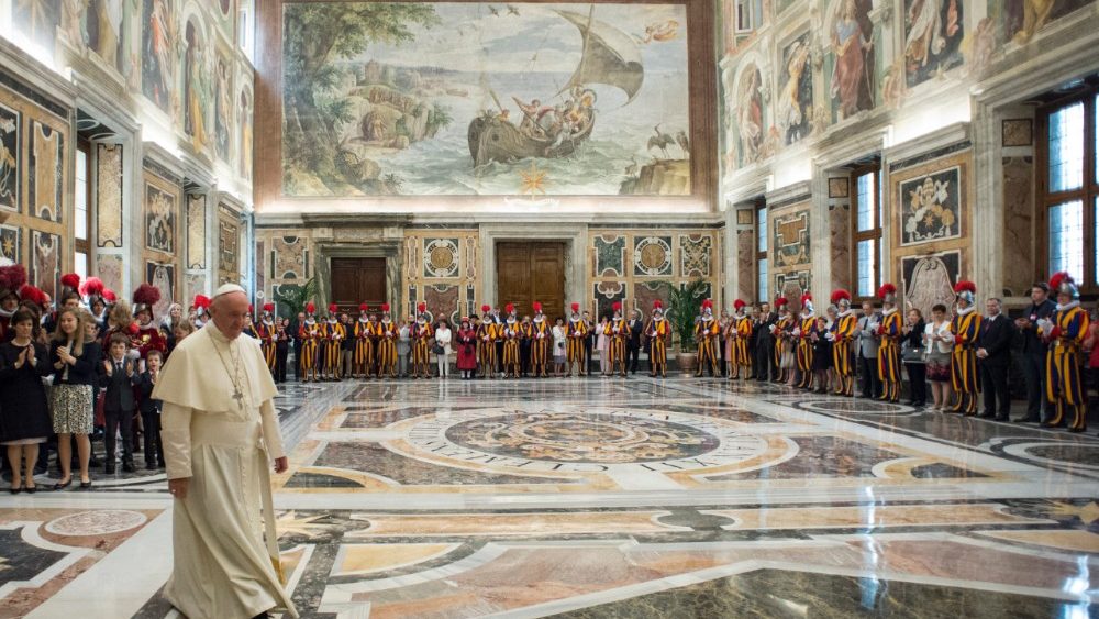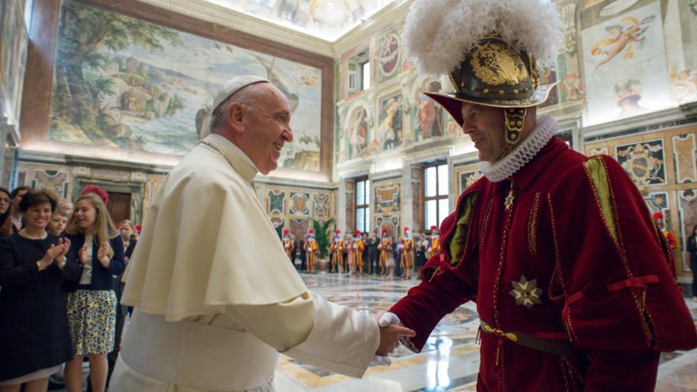 Vivere con coerenza la fede cattolica; perseverare nell’amicizia con Gesù e nell’amore verso la Chiesa; essere gioiosi e diligenti nei grandi come nei piccoli e umili compiti quotidiani; coraggio e pazienza, generosità e solidarietà con tutti. Queste sono le virtù che siete chiamati ad esercitare quando prestate il servizio d’onore e di sicurezza in Vaticano, come anche quando avete dismesso la divisa.