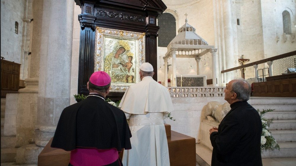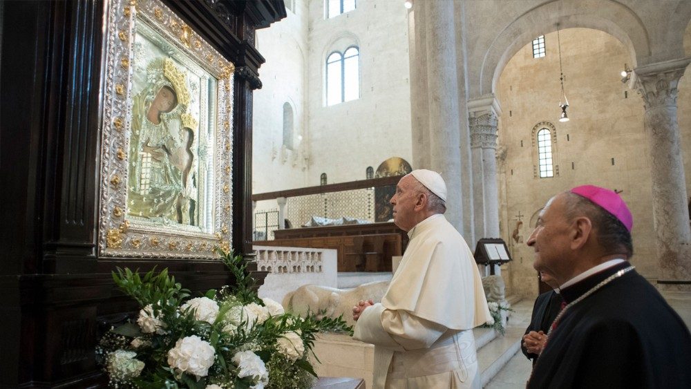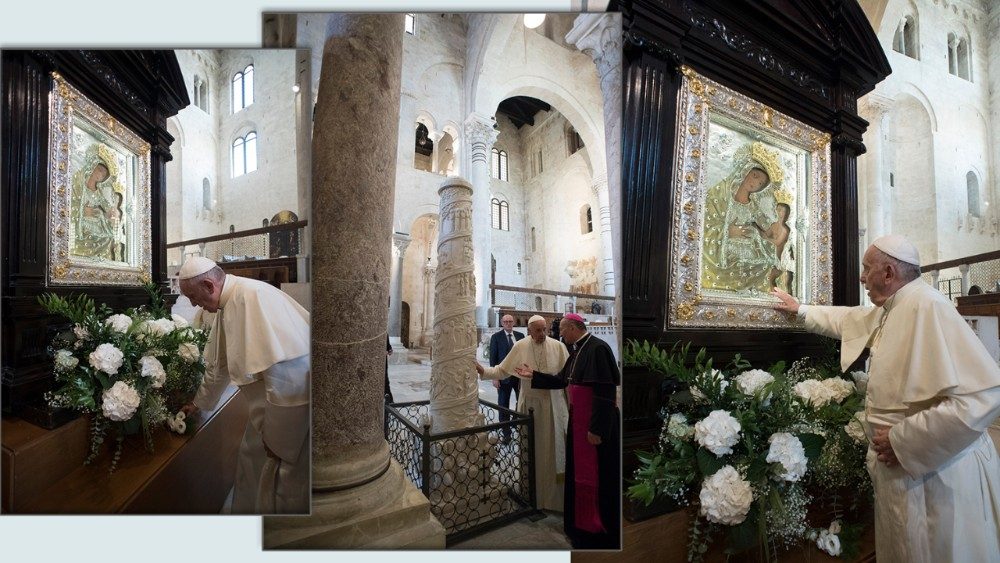 Al termine della giornata di riflessione e preghiera per la pace in Medio Oriente assieme ai capi di Chiese e Comunità cristiane della regione, Francesco ha voluto brevemente visitare la cattedrale di Bari, dedicata a Santa Maria Assunta. “Il Papa ha visto dall’arcivescovado, che è affianco, la cattedrale – che colpisce perché traforata, merlettata, del 1200 – e ha voluto guardarla”, visitarla, venerando “l’icona dell’Odegitria, icona di Maria”, racconta a Vatican News don Franco Lanzolla, parroco della cattedrale di Bari (Ascolta e scarica l'intervista a don Franco Lanzolla).