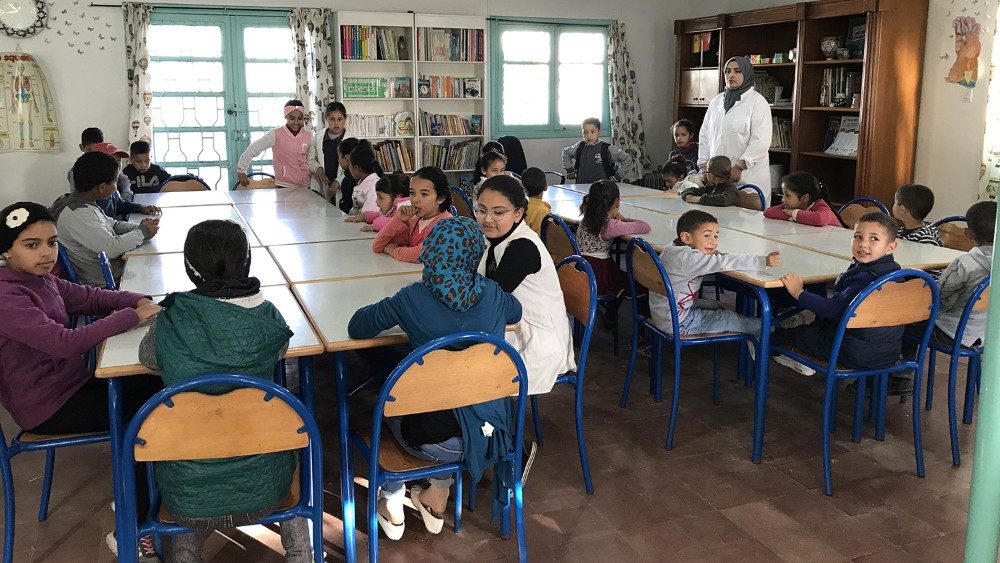 La gente di Témara, città di periferia ma con 300mila abitanti a 20 km a sud di Rabat, sulla strada per Casablanca, le chiama “rhibat”, in arabo “sorelle di Dio”, con grande affetto e rispetto. E loro, le tre religiose Figlie della Carità di San Vincenzo de Paoli che gestiscono il “Centre rural des services sociaux” che Papa Francesco visita in forma privata domenica mattina tra le 9.30 (le 10.30 in Italia), non hanno porte blindate né filo spinato sulle recinzioni, vivono con le porte aperte, che spalancano dalle 8 del mattino, quando una quarantina di bambini e ragazzini delle povere campagne nei dintorni vengono a fare colazione e poi una prima scolarizzazione.
